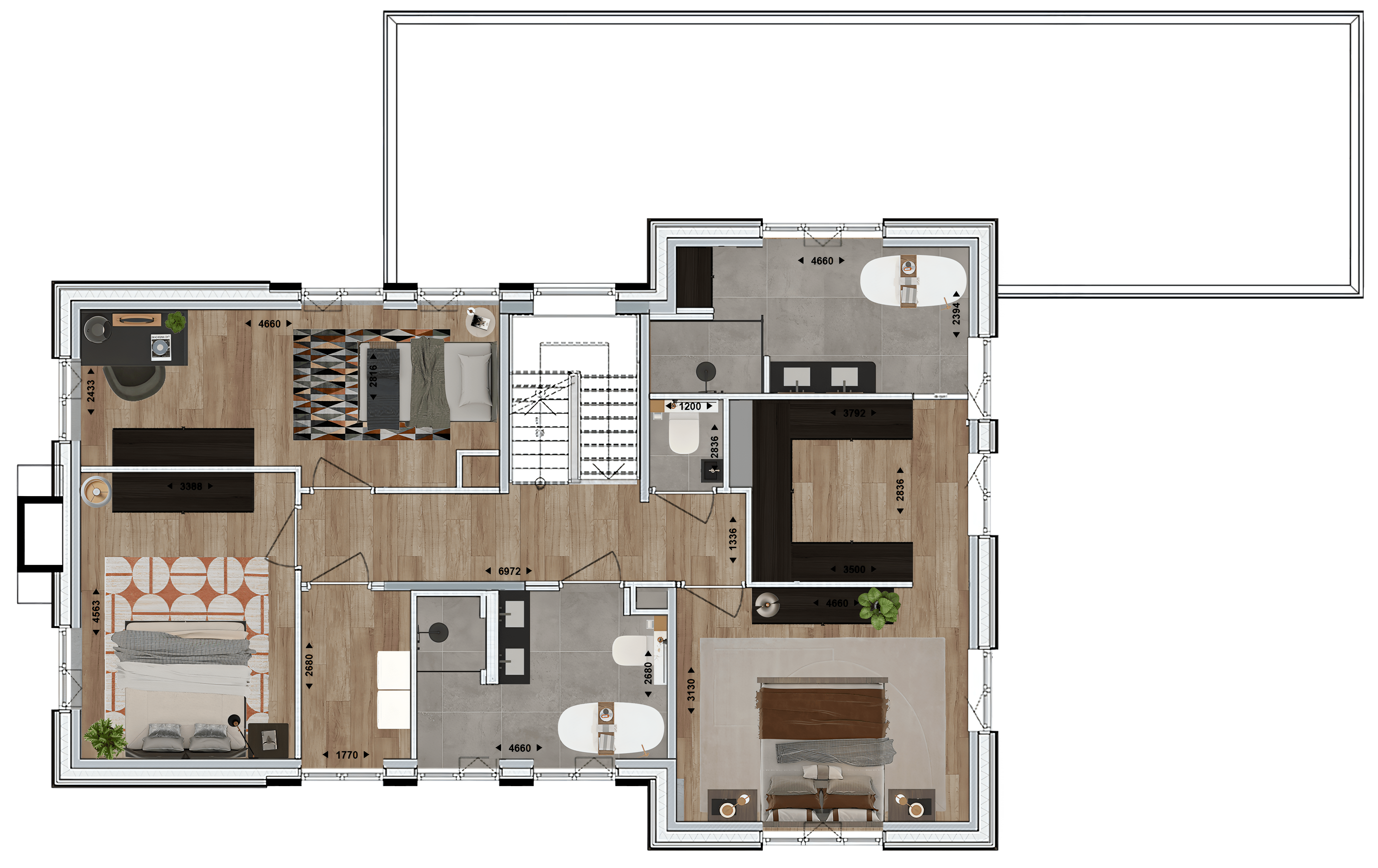 - Indeling zolderverdieping met 2 slaapkamers en een badkamerruimte