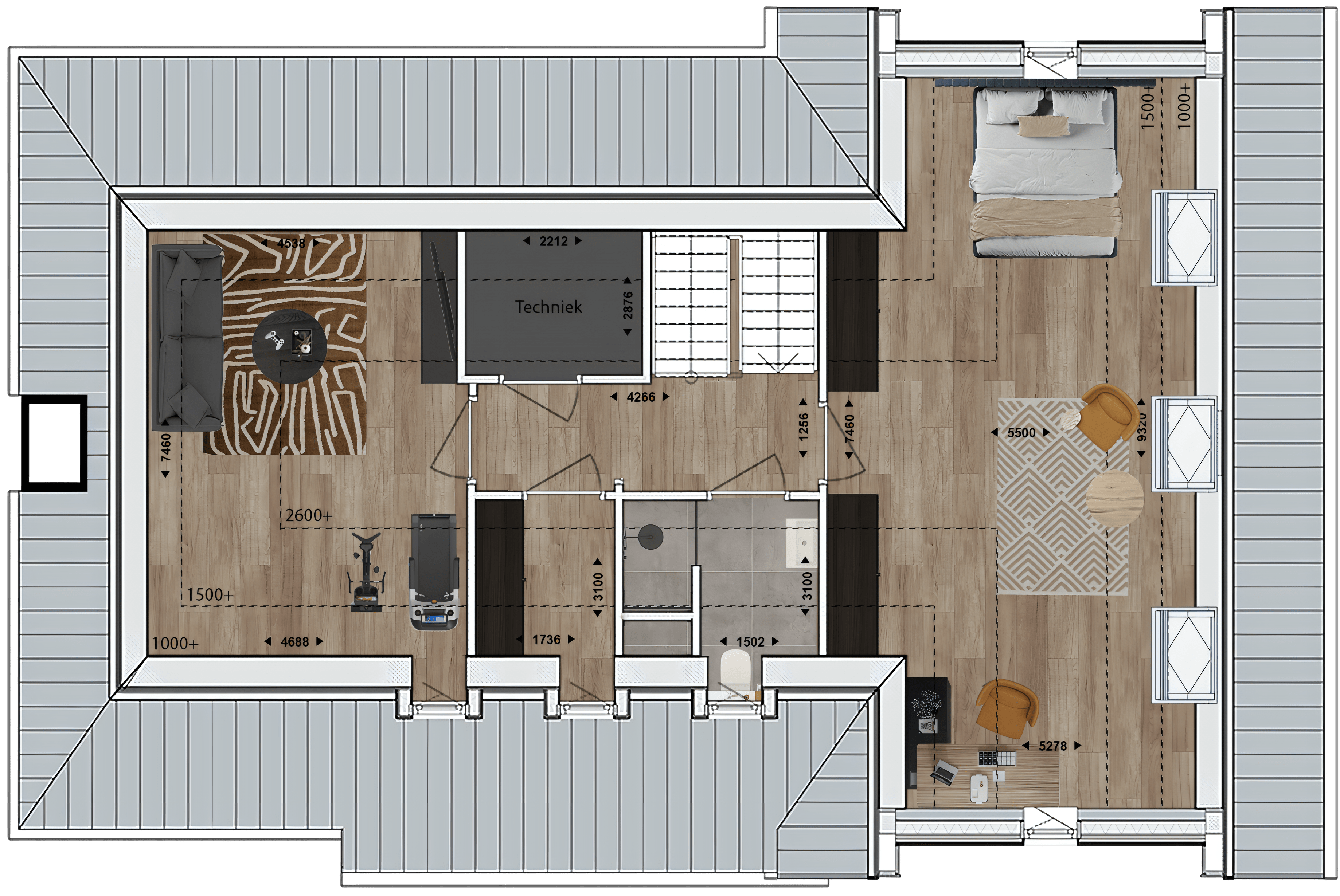 - Indeling zolderverdieping met 2 slaapkamers en een badkamerruimte